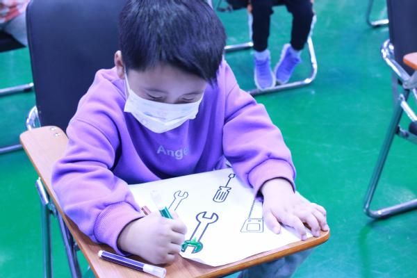 参观完实训中心,机电工程学院分团委还组织小朋友们进行机械工具认知实践。期间,小朋友们仔细观看卡通视频,了解生活常见基础性机械工具的使用方法,再在白纸上用水彩笔为工具涂色......边学边玩边做的氛围,让小朋友们乐开了花。