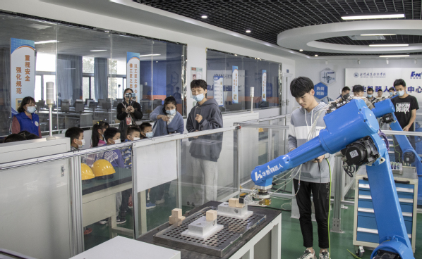 “机器人会弹钢琴!”“老师,老师,我知道,这是《小星星》!”“这边的机器人会夹弹珠、搭积木!”……在工业机器人实训中心,一台台机器手臂在电脑程序指挥下灵活地行动,这瞬间点燃了小朋友们的热情,不少孩子跟着琴声旋律唱起来。