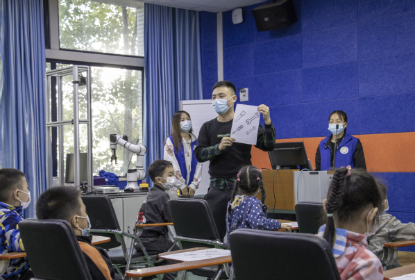 机电工程学院志愿者向小朋友讲解各种工具的使用