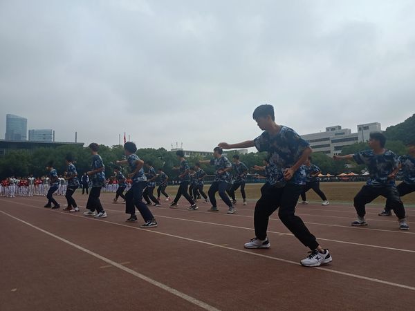 “嘿,哈!”26名同学,16个招式,16声口号,16次击打,他们铿锵有力,整齐划一地在主席台下展示军体拳,展现出机电工程学院的风采与气势。