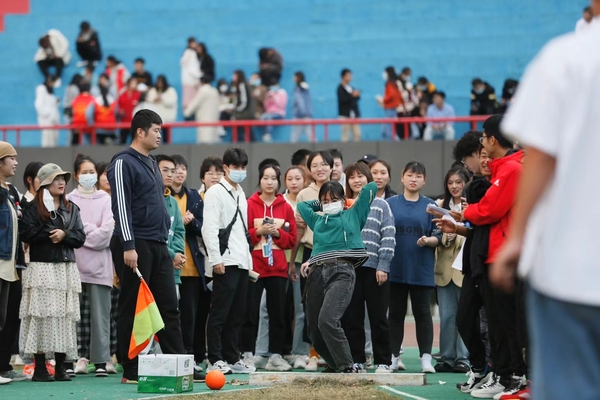 “哇塞,扔得好远……”场内,观众正驻足观看实心球团体比赛,20名机电学子共同努力,最终荣获实心球团体第一好成绩。