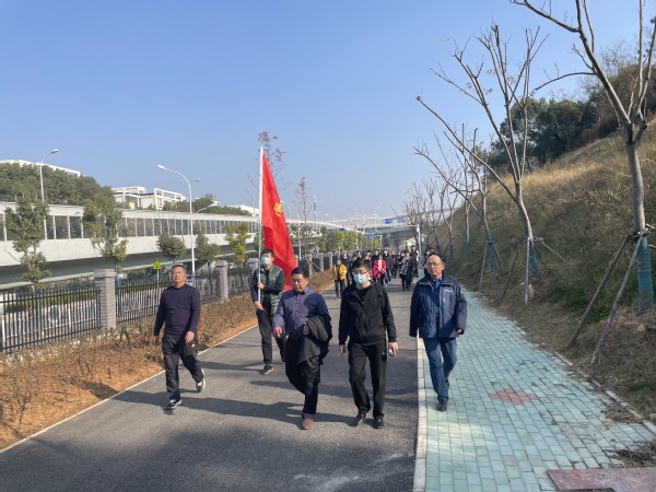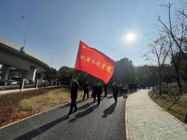 沐浴在冬日暖阳中,机电工程学院的老师们跟随学院大旗,从机电学院开始,沿凌碧湖、凌家山环山路、逸云楼(北)、图书馆、逸思楼、思源楼、东逸九舍、东逸十舍这条线路,环校园徒步,最终回到机电学院。