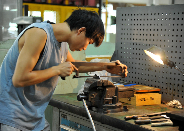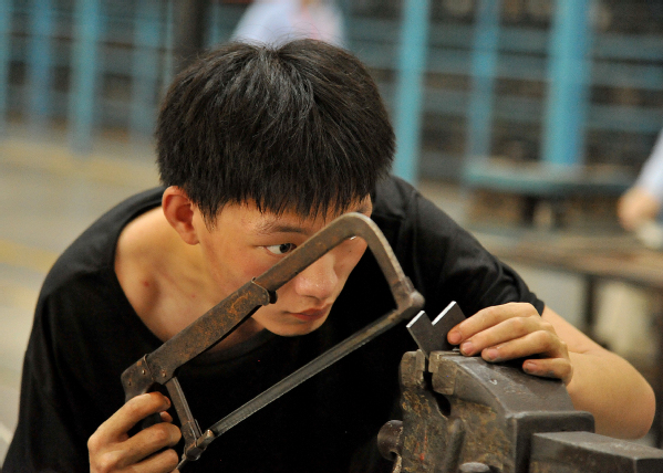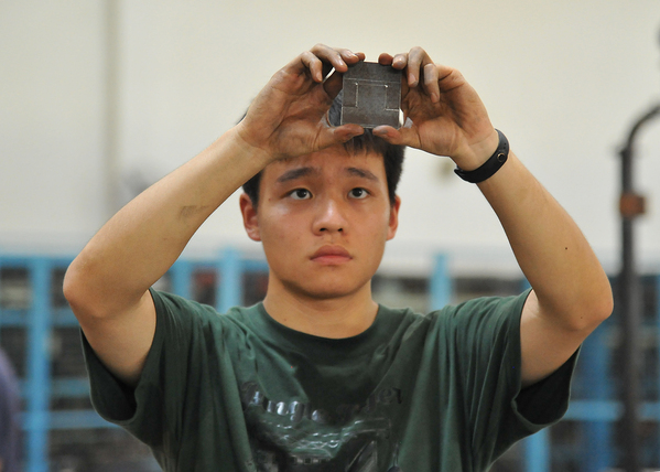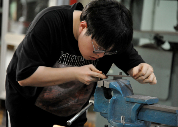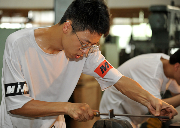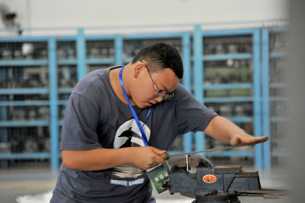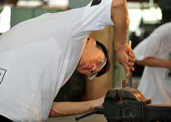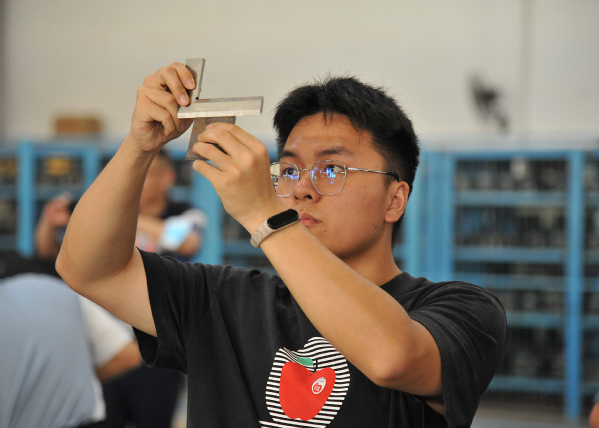 本次比赛历时1个月,分为初赛和决赛。初赛在机电工程学院举行,共计 60名学生报名参与角逐,最终有30名选手晋级本次决赛。决赛阶段分为学生组和企业职工组,裁判由校企双方专业人员组成。要求选手独立完成划线、打孔、去孔口毛刺作业,主要考察选手的工件划线位置和孔位尺寸、中心线与两边对称度以及凸凹件的配合和长螺杆有无明显倾斜等。