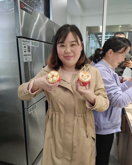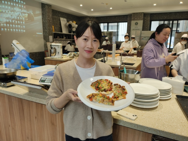 下午2:00,女教师们在分工会主席万涵宇带领下,走进逸云楼“美好生活技能创新创业实践基地”西点厨房,在烘焙老师指导下制作披萨和纸杯蛋糕。虽然是烘焙“小白”,初次上手竟也做得有模有样,让烘焙老师直夸有天分。有的老师灵机一动,做出爱心形状披萨,获得一众菲林“青睐”,成就感满满。