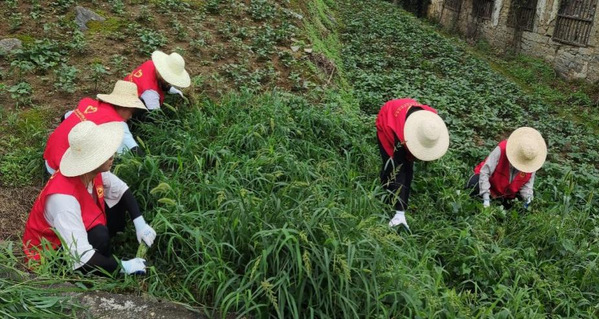 正值番薯苗生长关键期,7月8日-9日,实践团在村委会工作人员的带领下,分组帮扶村内劳动力短缺易返贫家庭除草、育苗。