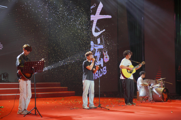 第二篇章以“青春” 为核,串联师生同台、歌舞乐器等多元表演,以鲜活舞台语言展现新生活力,将晚会氛围推向又一高潮。新生辅导员华崇志与 25 级班长并肩登台,共唱《New Boy》,师生同框令台下瞬间沸腾;舞蹈串烧《热烈的朋友》中,舞者身着白衣、搭配特色挂饰,以利落动作与饱满情绪展现青春张扬;李昱樊献唱《将故事写成我们》,温柔歌声配浪漫灯光,传递青春美好情愫;创乐协会学子奏唱《风吹麦浪》《大城小爱》,带领观众感受音乐魅力,碰撞别样火花。