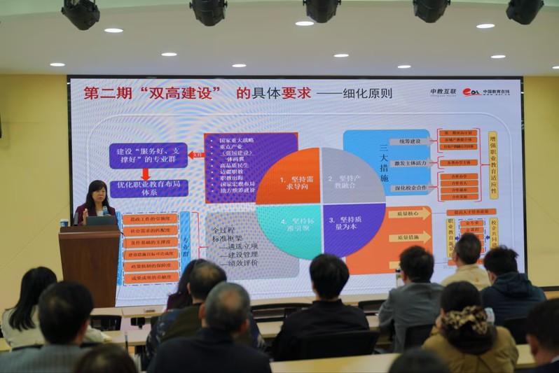 赵欣以《第二期“双高建设”视角下的建设任务思考与探索》为题,围绕政策背景、关键任务、标志性成果、培育与建设四大维度,为现场教师系统解读了第二期“双高计划”的内涵特征、建设思路与实施方式。她指出,“双高建设计划”一期看底子,二期看路子;一期比硬件,二期比贡献;一期重建设,二期重改革,“新双高”建设是在第一期“双高建设计划”基础上的深化拓展与有力推进。