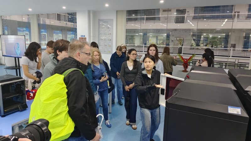 随后,在学院师生的引导下,德国师生先后参观了3D打印技术中心与工业机器人实训中心。在3D打印技术中心,师生们近距离观摩各类3D打印设备的运作流程,聆听工作人员对技术原理、应用场景及行业发展前景的讲解,不时驻足询问,对3D打印技术在智能制造领域的创新应用表现出浓厚兴趣。