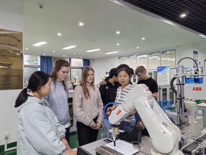 在工业机器人实训中心,交流活动进入高潮。德方师生亲身参与ABB工业机器人操作体验,在智能制造学院专业教师的耐心指导下,德国师生从基础操作规范入手,逐步掌握机器人编程及简单作业流程,沉浸式感受工业机器人技术的魅力,切实体验了我院实训教学的专业性与实践性。操作过程中,中德师生相互交流操作技巧,分享学习心得,现场氛围热烈融洽。